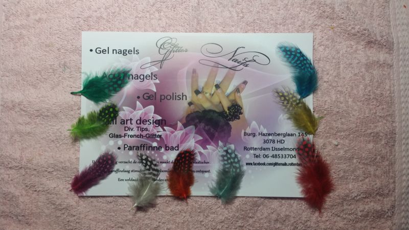 Veer nail art om een mooi 3D effect te krijgen verwerk ik de echte veer in de acrylnagels. Dit kan in verschillende kleuren.